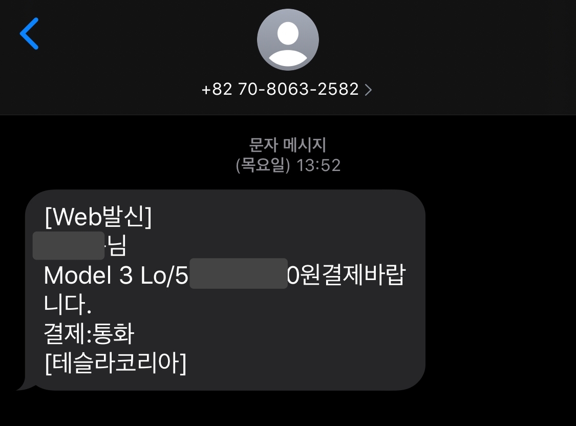 결제 관련 메일 응답을 확인한 나의 테슬라 인도 담당자는 카드 결제 문자를 나에게 전송한다.
