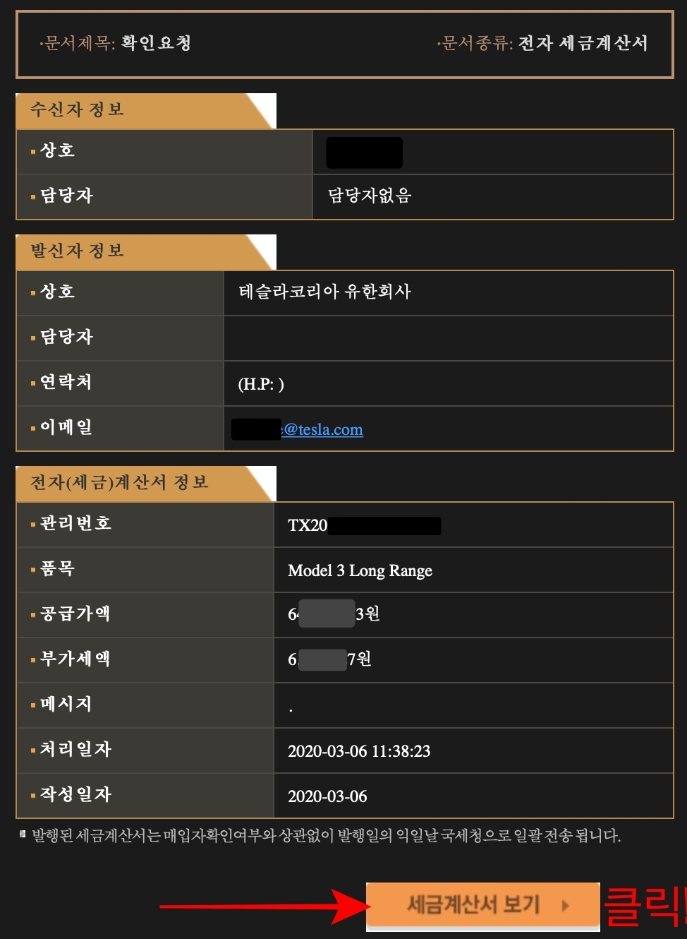 결제가 완료되고 다음날 세금계산서가 왔다. '[테슬라코리아 유한회사 님]으로부터 발생한 세금계산서가 도착했습니다.' 는 메일 제목이다.